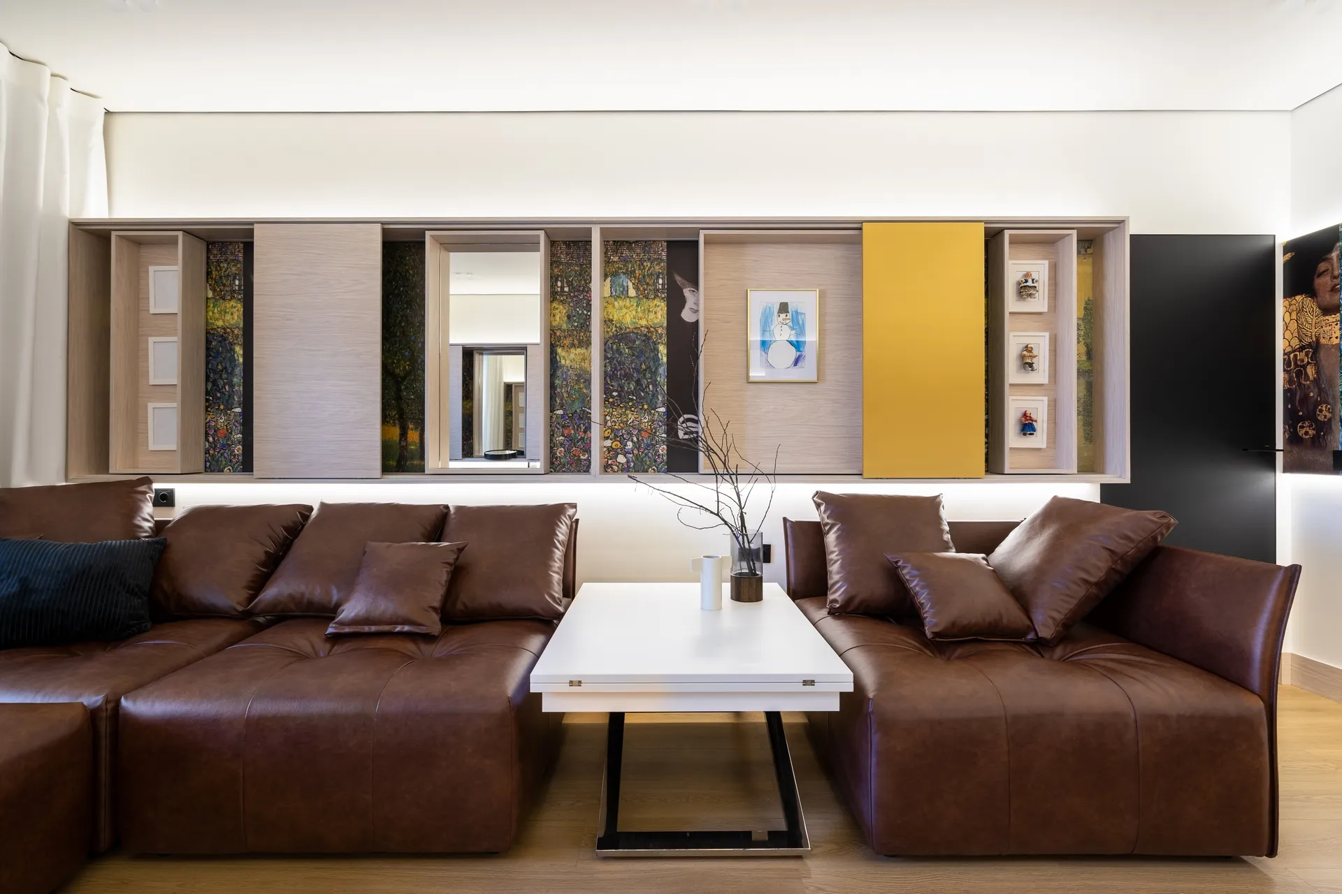 Подушки тоже в чехлах из экокожи, чтобы не отвлекали внимание от будущих экспонатов арт-галереи.