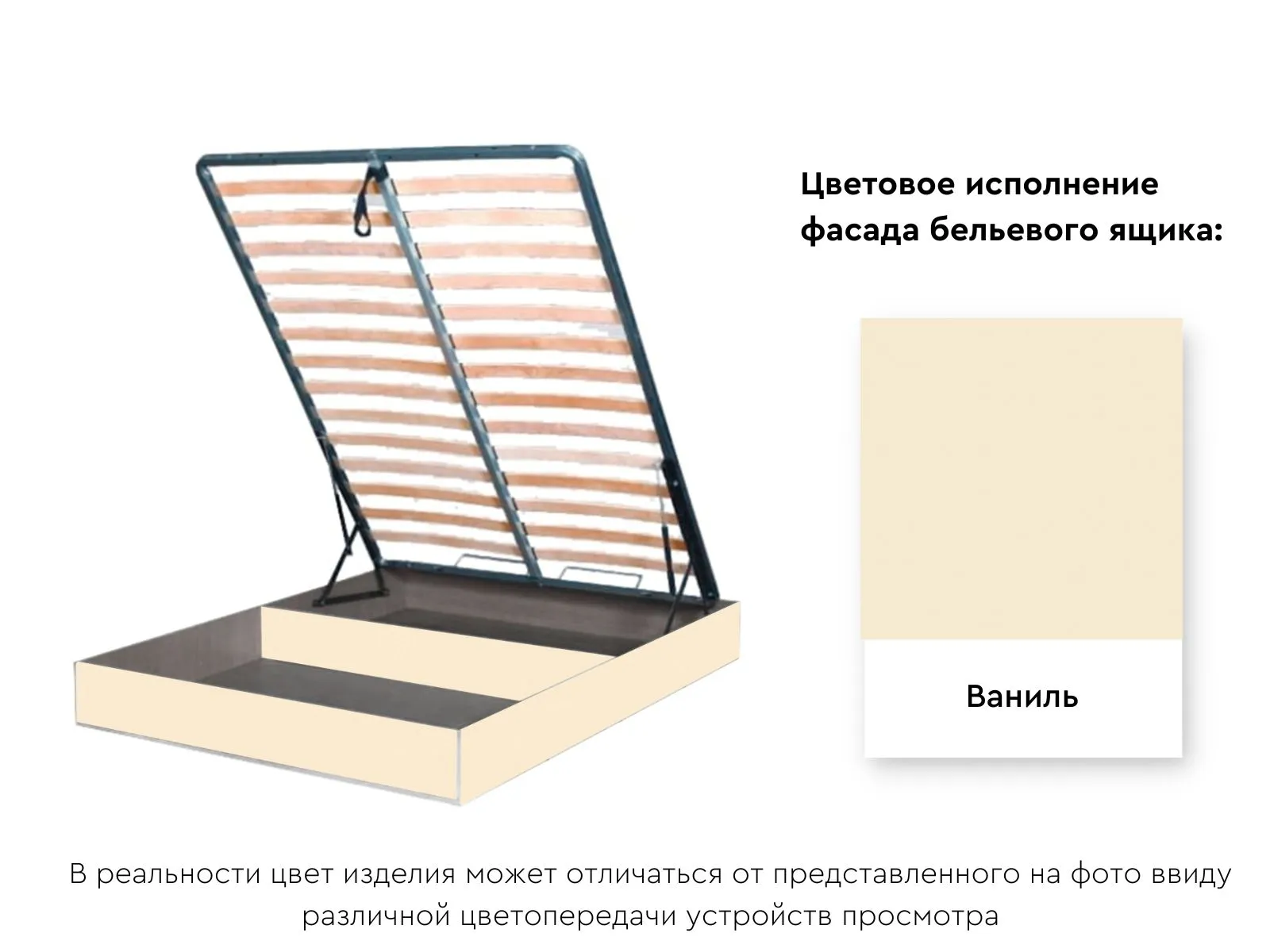 Размеры бельевого ящика соответствуют размерам кроватного основания, что позволяет использовать его максимально эффективно. Также ящик представлен в различных цветах.