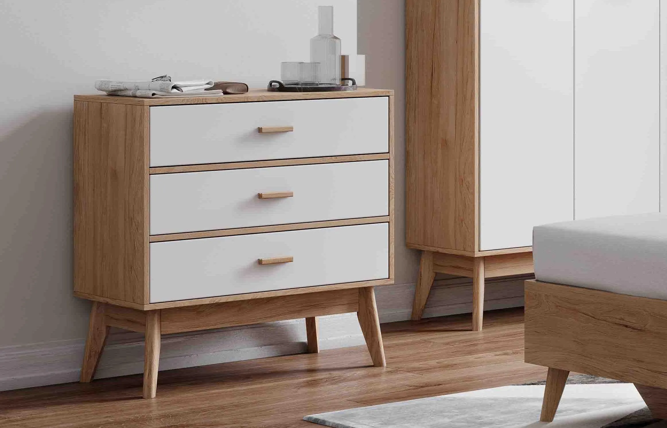 <virtues>Комод приобретался вместе со спальней Калгари. Очень функционален, ничего лишнего. Выполнен в модном сейчас стиле Сканди. За счет высоких ножек из массива дерева и белых фасадов из МДФ смотрится легко, не загромождает пространство. Весьма практичный, вмещает много вещей. Ящики открываются плавно. Покупкой довольна.</virtues> <limitations>нет</limitations>