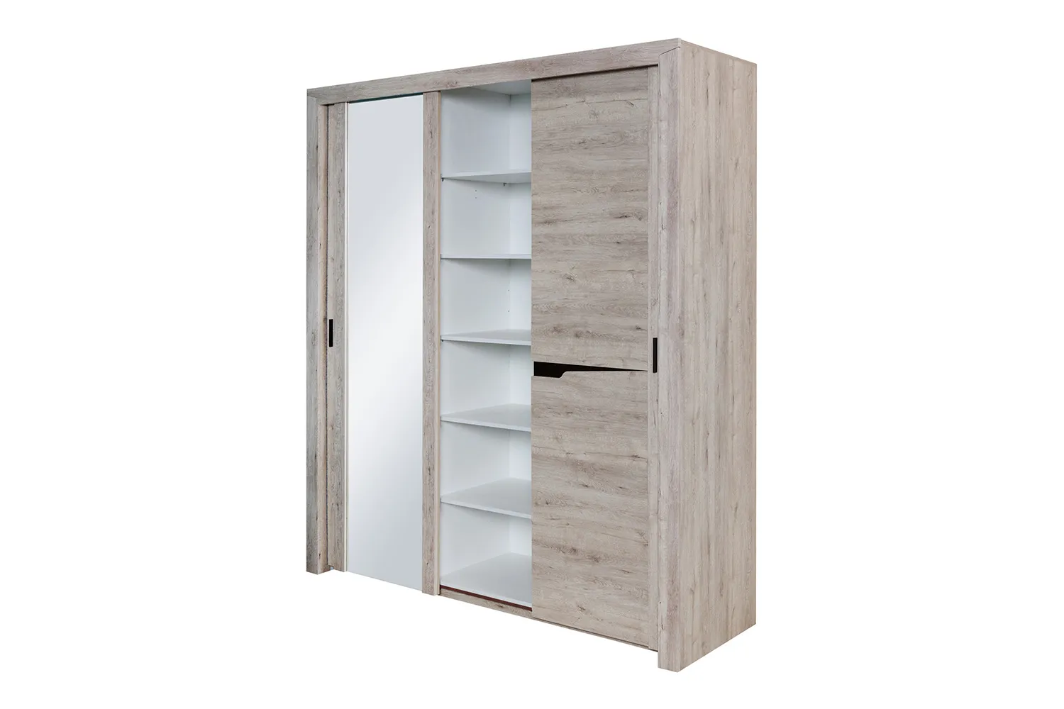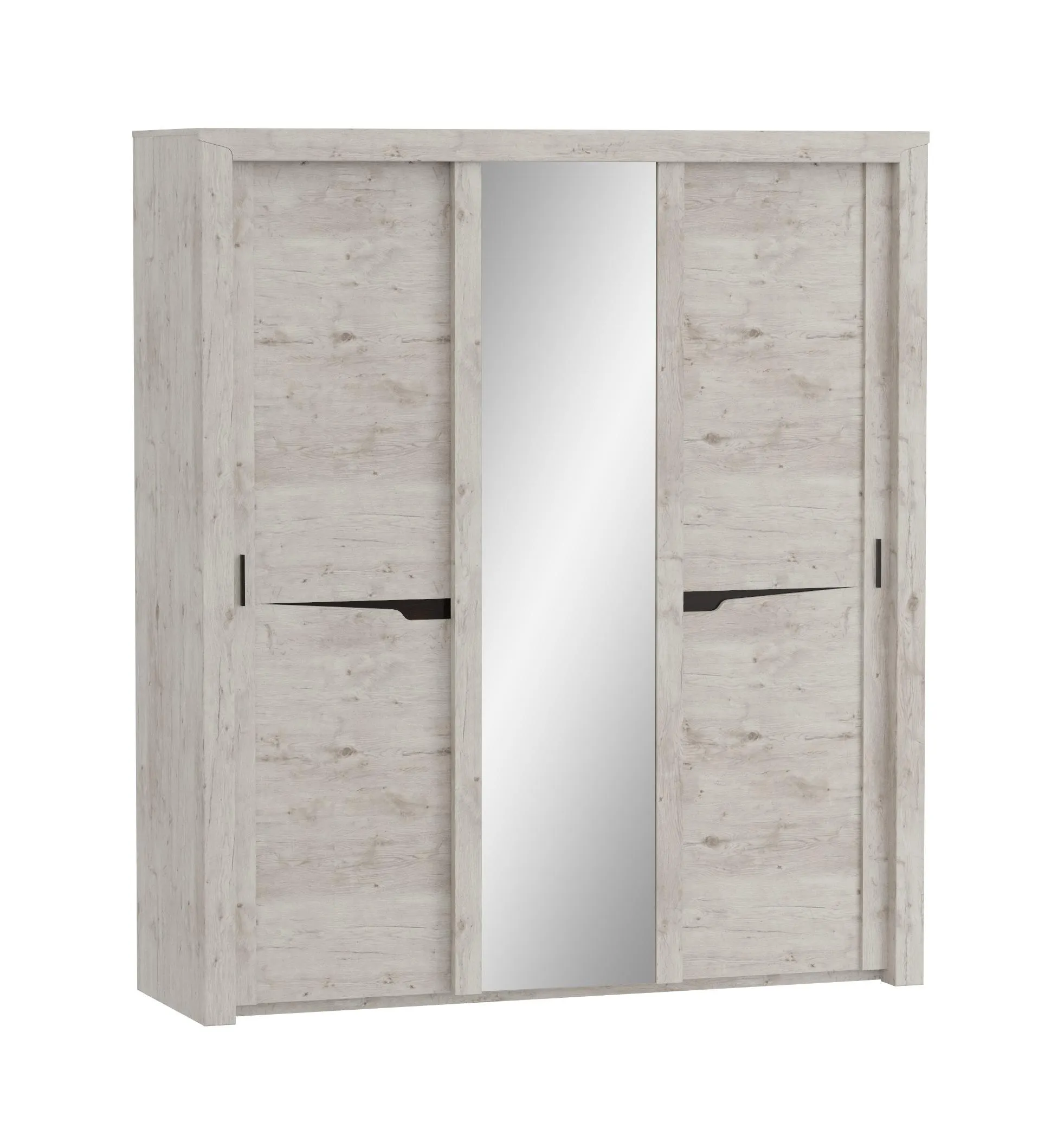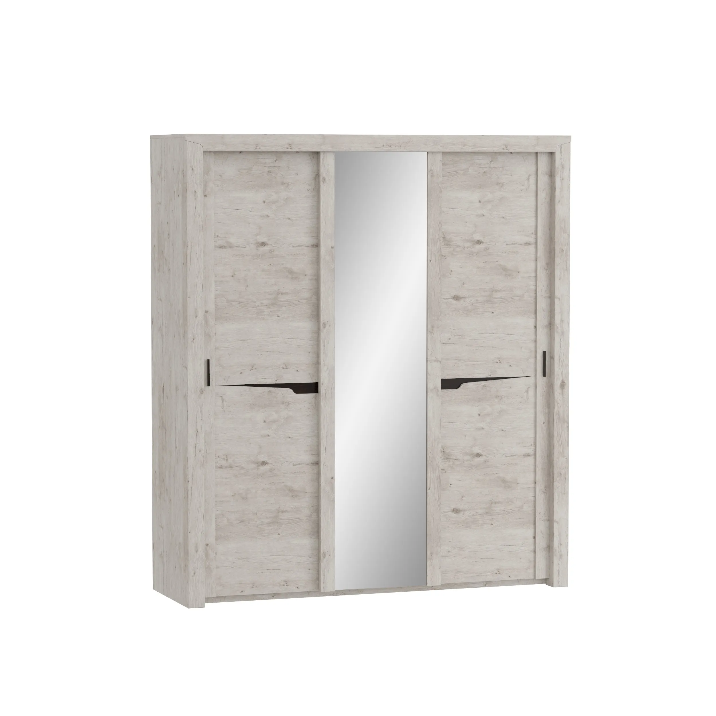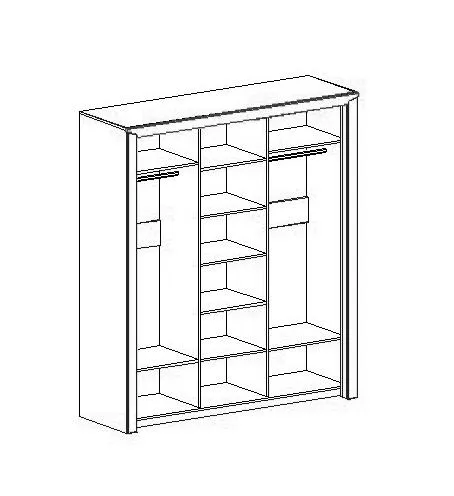 Внутреннее пространство шкафа разделено стенками на три отделения, по бокам располагаются платяные, а по центру бельевое с тремя съемными и двумя стационарными полками. В платяных отделениях установлено по одной продольной стальной штанге, над которыми размещается стационарная, а в низу съемная щитовая полка. Фасадная часть шкафа выполнена в виде трех дверей. На центральной двери наклеено зеркало, по бокам от которого закреплены две декоративные планки из МДФ. Боковые двери имеют составную конструкцию с декоративным вырезом и одной боковой планкой с установленной на ней ручкой.