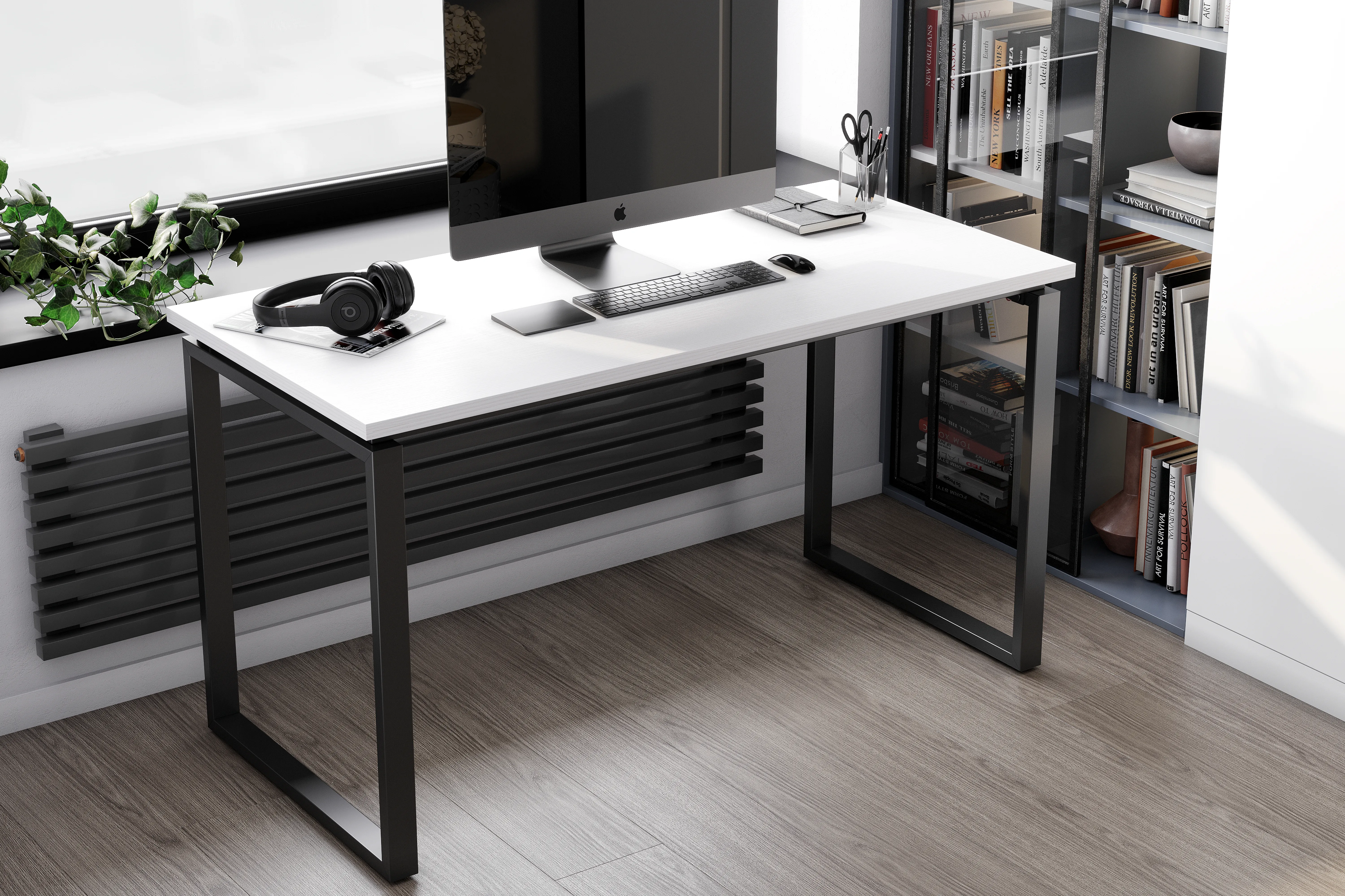 Металлический каркас для стола из прямоугольных замкнутых опор с парящей столешницей. Cкрытые под столешницей связи не позволяют столу шататься как на отдельных ножках |
