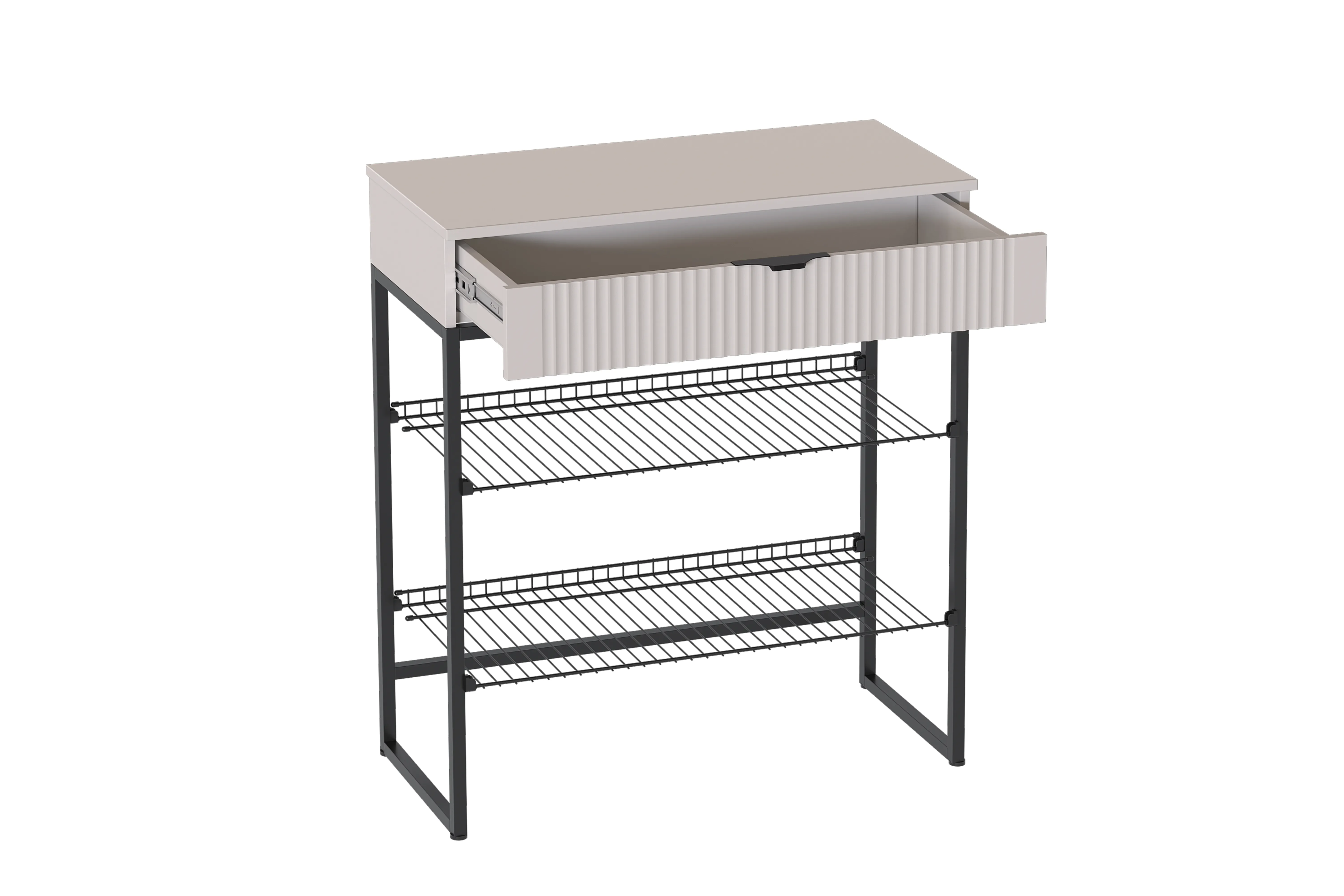 Тумба для обуви "Нора" состоит из несущего металлического каркаса и закрепленного к нему корпуса из ЛДСП , внутри которого установлен выдвижной ящик на шариковых направляющих с доводчиками. Между боковыми металлическими рамами закрепляются стальные сетки для хранения обуви.