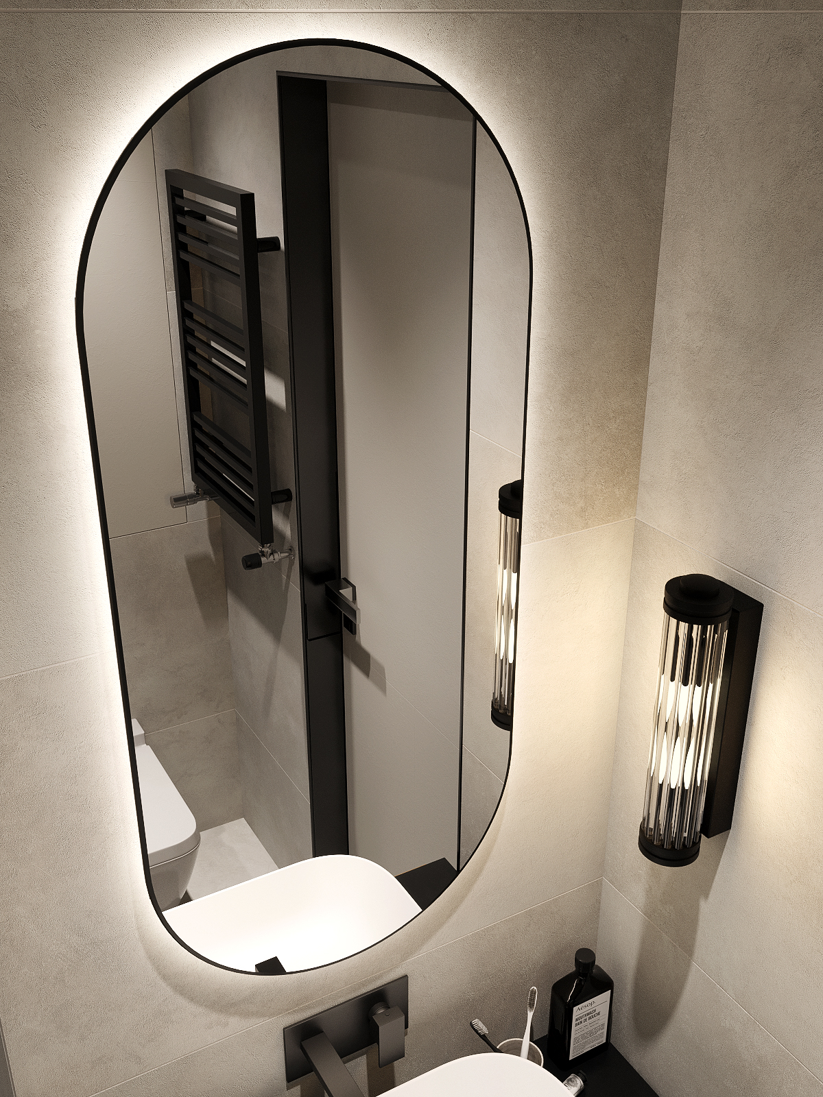 УФ-печать черного контура. Зеркало оснащено пластинами для крепления к стене и светодиодной лентой с выключателем, срабатывающим от взмаха руки. Упаковка представляет собой сбитый короб, состоящий из ЛДСП и ХДФ (сбитый на скобу). Дюбель-гвоздь приобретается отдельно, исходя из материала стен. |