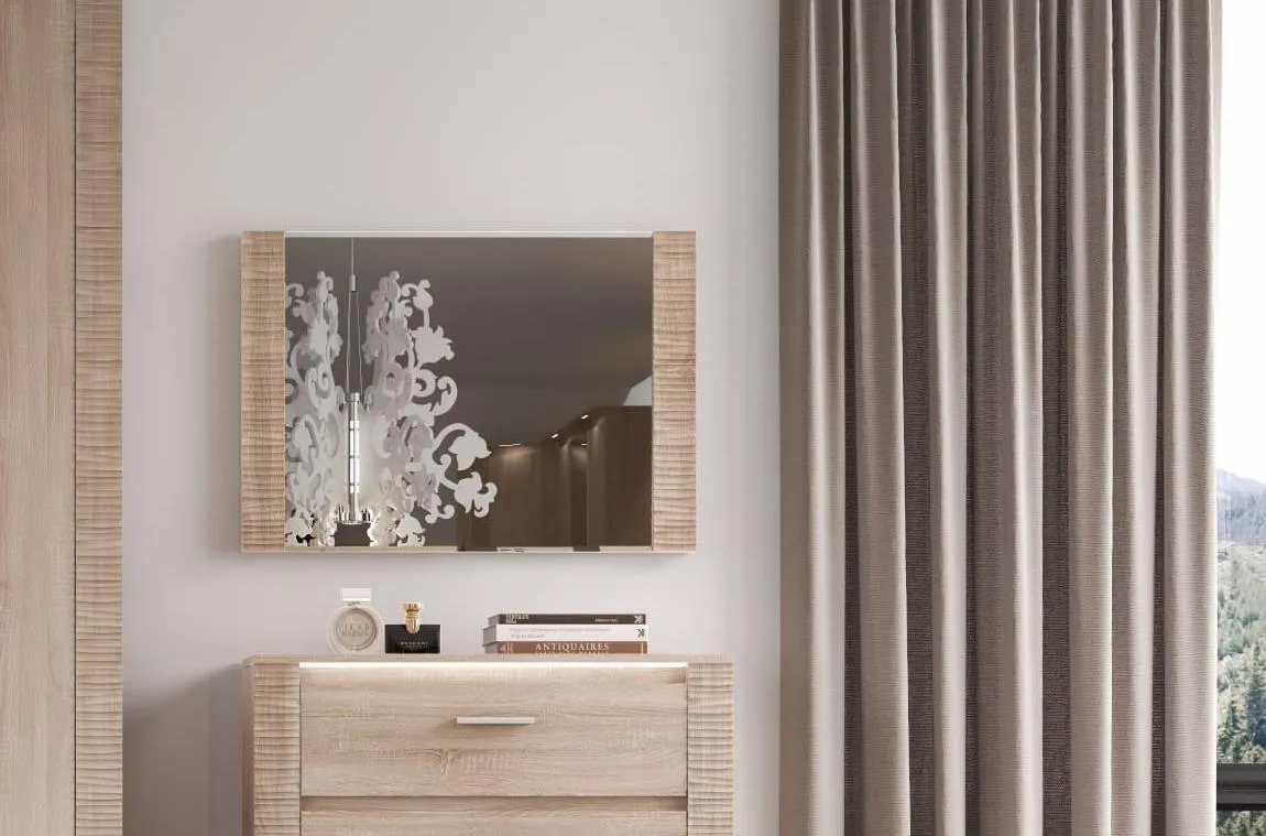 Зеркало имеет дополнительный элемент декора - накладка из МДФ с фрезой и отлично подходит для спальни.